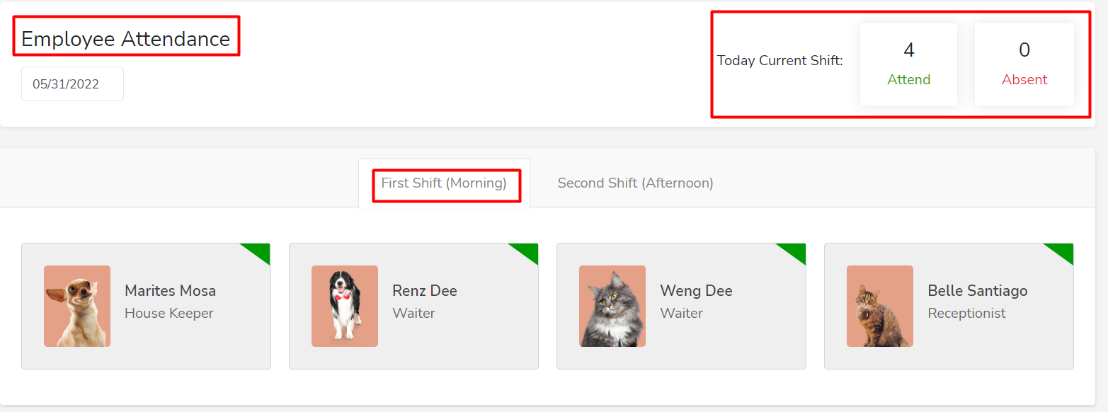 Step 5: Back to duty roster > after following the steps above, you will now see in the Employee Attendance Dashboard the number of "today's current shift" and the list of employees attending.