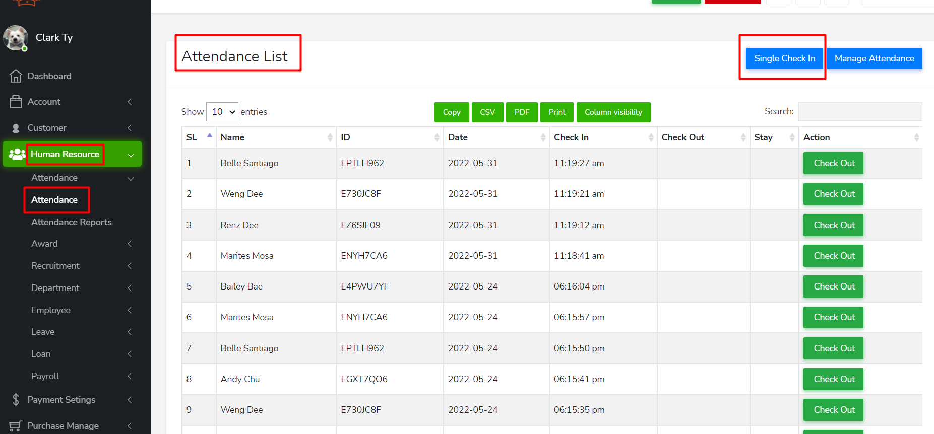 Step 4: Go to "Human Resource" > "Attendance" then click the "Single Check In" button for you to manually select employees ready for check-in.